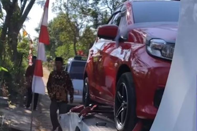 Viral Honda Brio merah digendong truk towing dengan kata-kata UNTUK ISTRIKU TERSAYANG sebagai seserahan nikah di Ponorogo