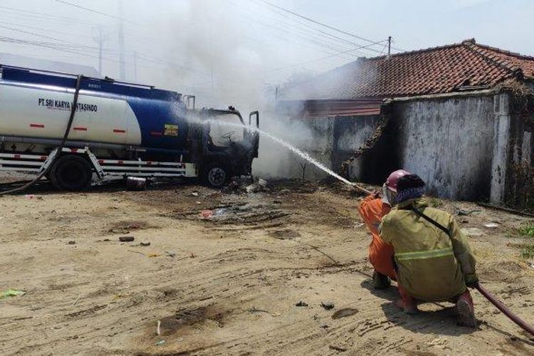 Truk tangki BBM PT Sri Karya Lintas Sindo terbakar hebat hingga kabin hitam legam di dalam gudang, Solar aman