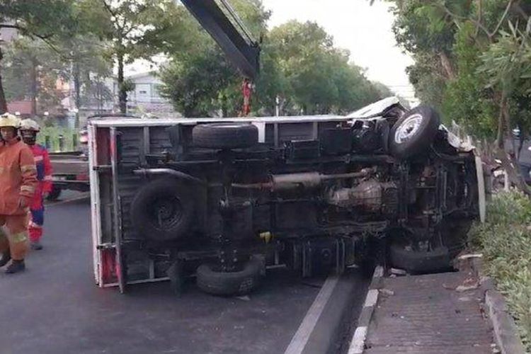 Jl Ahmad Yani Wonocolo Surabaya jadi ajang pamer kolong dan kaki-kaki Isuzu Traga usai tampar batang pohon
