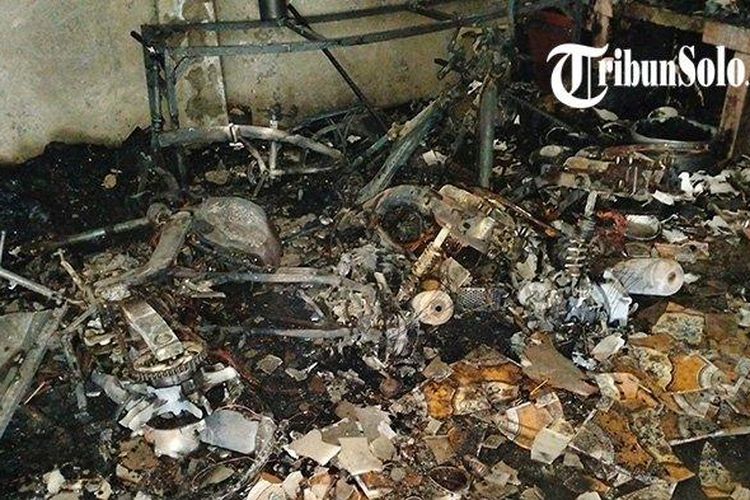 Dua Yamaha Mio dan Honda MegaPro ludes terbakar sisa rangka di sebuah ruko. Pemilik ruko rugi sampai Rp 150 juta