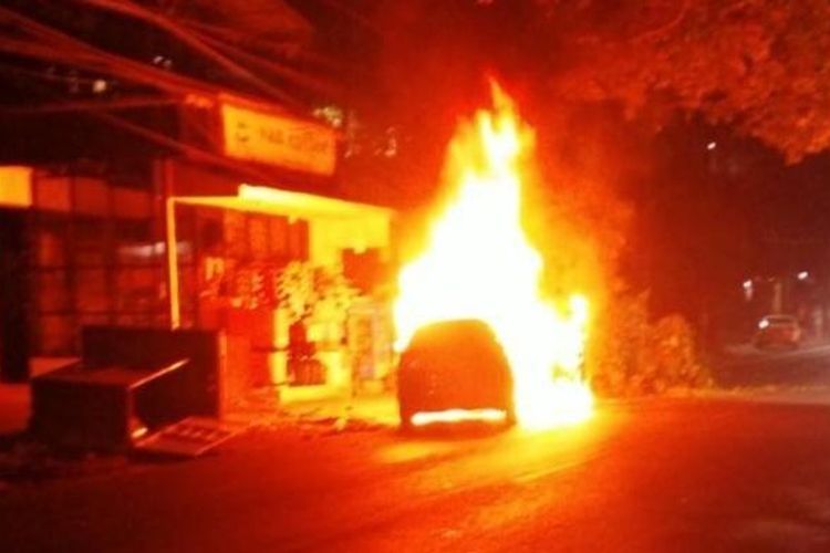 Honda Jazz ludes terbakar usai hantam rak bensin dini hari. Pengemudi diduga dalam pengaruh cairan pembuat teler