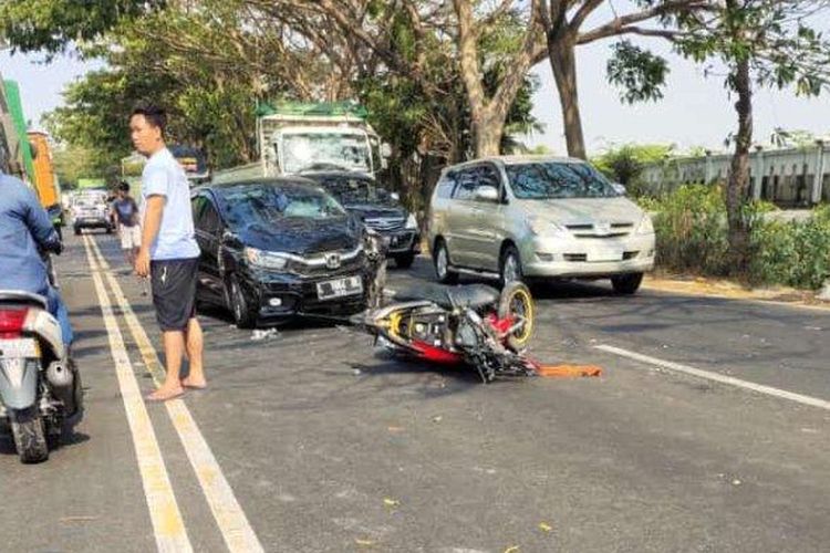 Honda Brio melambung melewati dua garis di jalan hingga masuk ke jalur berlawanan. Akibatnya 3 pemotor harus dibawa ke rumah sakit