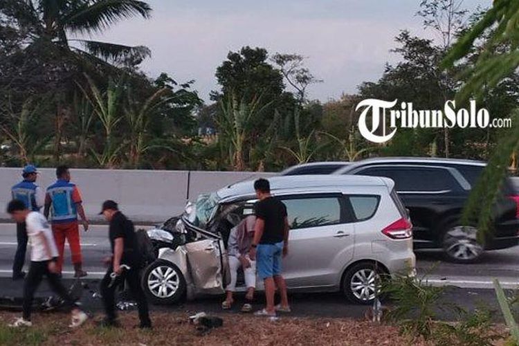 Suzuki Ertiga ringsek wajah depan usai tusuk truk di Tol Semarang-Solo. Beruntung tidak ada korban jiwa dalam kecelakaan ini