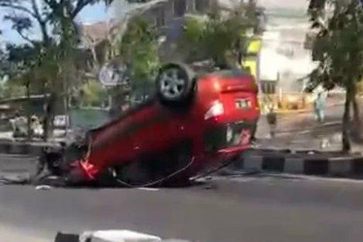 Suzuki SX4 yang dibawa ibu dan anak terbalik, kayang tatap langit di ringroad Sleman akibat pecah ban, tubuh korprol di dalam kabin