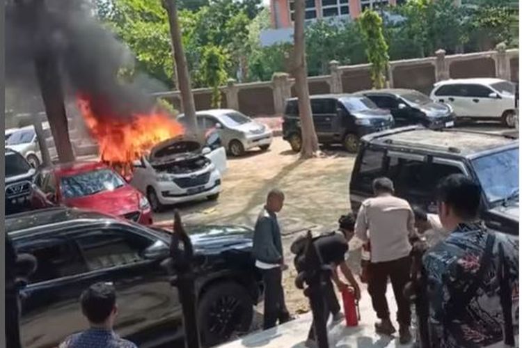 Toyota Avanza yang parkir di kampus ISI Solo terbakar hebat saat acara wisuda, api cepat melahap seluruh bagian hingga jadi rongsokan