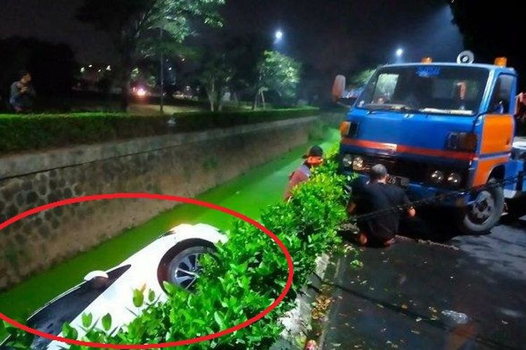 Honda Brio kecemplung selokan berair hijau di Perumahan Metland, Cileungsi Bogor akibat ngitip Google Maps