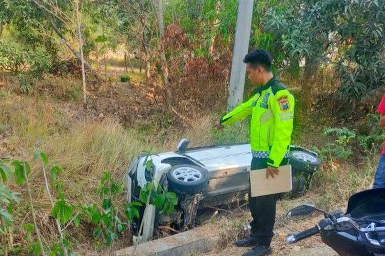 Daihatsu Ayla isi satu keluarga rebahan di selokan. Pulang hajatan malah ketiban apes gara-gara sopir merem melek alias ngantuk
