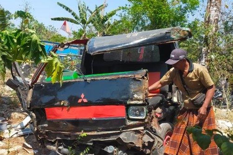 Pikap bertuliskan Semangka Indah ini parkir dalam kondisi ringsek di tempat yang bikin merinding. Petaka salah injak pedal gas
