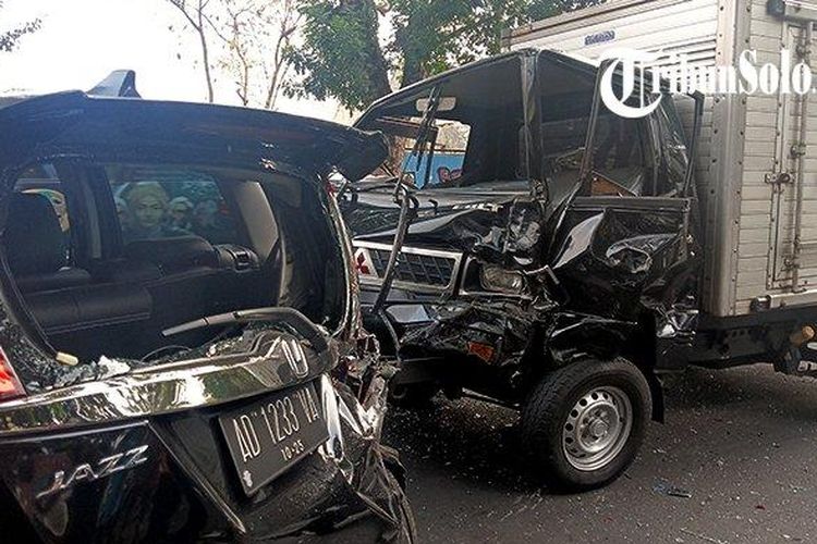 Kecelakaan beruntun di Ngapeman Jl Slamet Riyadi kota Solo, Mitsubishi L300 Box, Honda Jazz GK5, Toyota Avanza dan Daihatsu Sigra