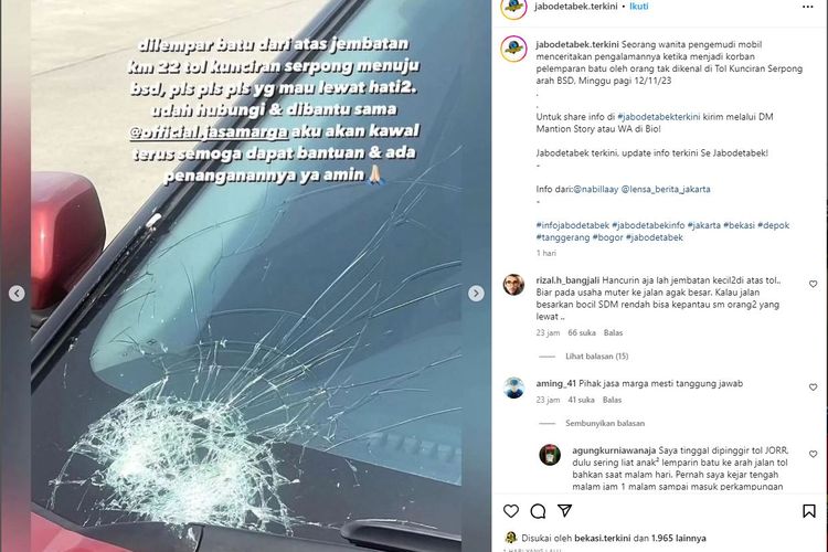Dalam waktu sehari ada 3 mobil jadi korban pelemparan batu di KM 22 tol Kunciran arah BSD dengan akibat pecah kaca