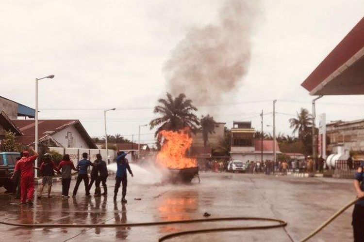 Suzuki Carry pikap mendadak terbakar di SPBU Kutau Kota Medan, Kota Manna, Bengkulu Selatan saat antre Pertalite