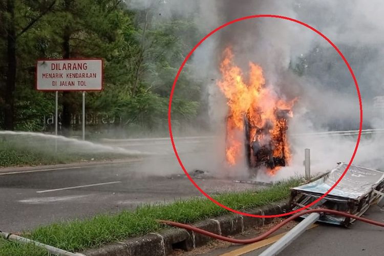 Toyota Alphard terbakar hebat di gerbang tol Bintaro Xchange usai tabrak tiang lampu jalan dan terguling