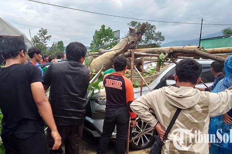 Toyota Veloz mendadak dikerubuti banyak orang setelah kondisinya semrawut digebrak pohon tumbang di dusun Pakel, Gerdu, Karangpandan, Karanganyar