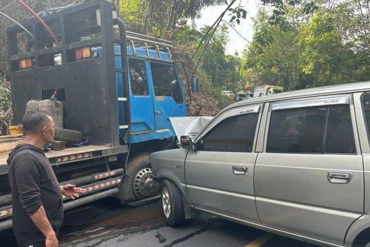 Toyota Kijang Kapsul dikemudikan pemuda dan pemudi di Rejang Lebong berubah acak-acakan, bodi cacat nempel di roda truk tronton