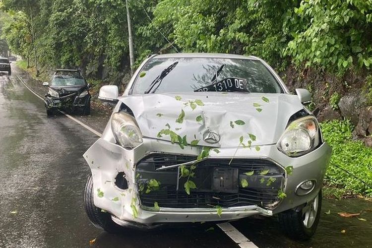 Daihatsu Ayla dan Toyota Rush korban kap mesin dadakan ketika enak-enak melintas di jalan raya. Ada yang tiba-tiba menggebrak