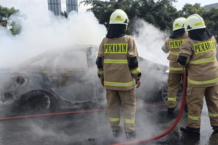 Ford Focus sisa rangka alias ludes luar dalam usai diserbu api saat melintas di Tol JORR. Berawal pengemudi cium bau tak sedap