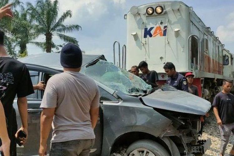 Innova Reborn berisi dua pelajar SMA tak karuan diseret kereta api sejauh 400 meter. 1 nyawa melayang