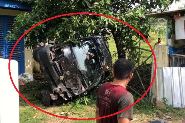 Daihatsu Gran Max terbang dan mendarat posisi nyaris terguling di antara rumah irigasi dan pohon akibat sopir lihat sekelebat orang lalu hilang