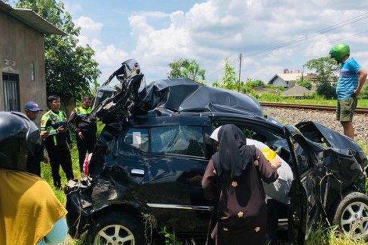 Daihatsu Ayla nggak karuan bodinya usai diterjang Kereta Api Matarmaja. Efek sopir kurang konsentrasi pulang melatih burung