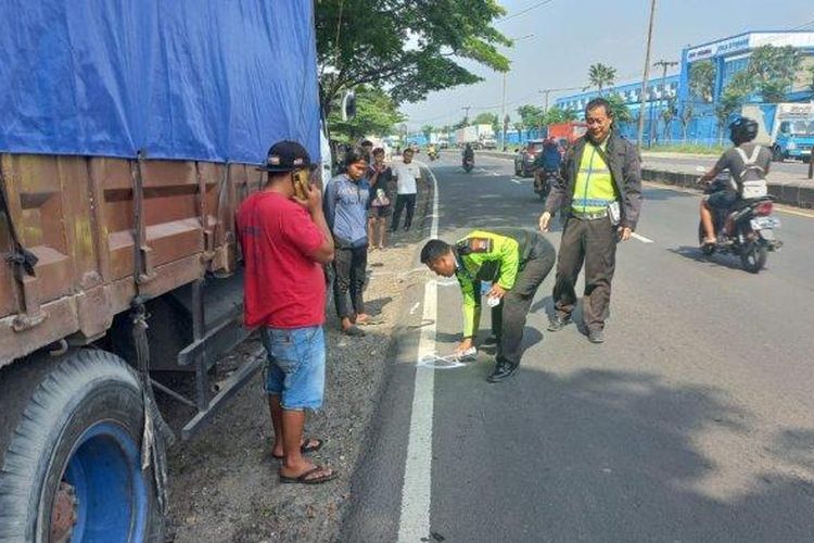 Tubuh Dwi Agung Lukito (22) disambar truk trailer saat ganti ban truk tronton di tepi jalan ByPass Krian Sidoarjo Jawa Timur