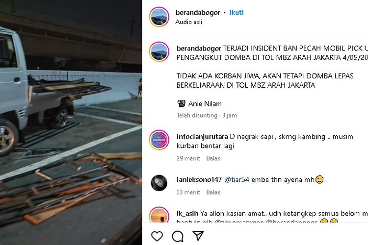 Sebuah pikap terlibat kecelakaan di Tol MBZ berawal karena pecah ban. Korban-korban yang dimuat berhamburan dan berlarian