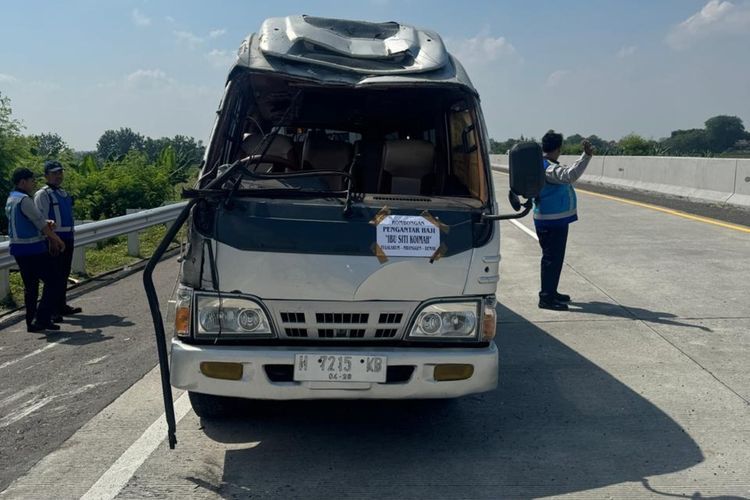 Celaka, Bodi Kanan Isuzu Elf Rombongan Pengantar Haji Sentuh Beton Tol Semarang-Solo