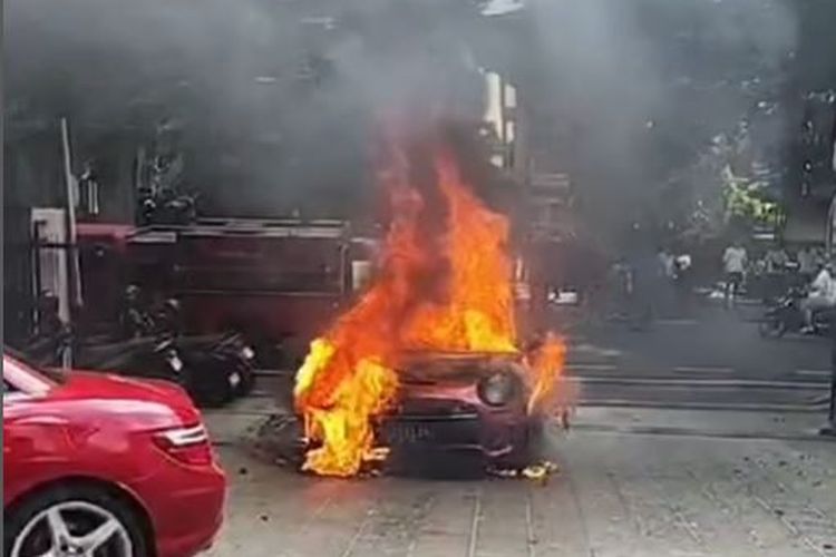 Mini Cooper Clubman milik dokter terbakar hebat di tempat praktiknya jalan raya Puputan, Renon, kota Denpasar, Bali