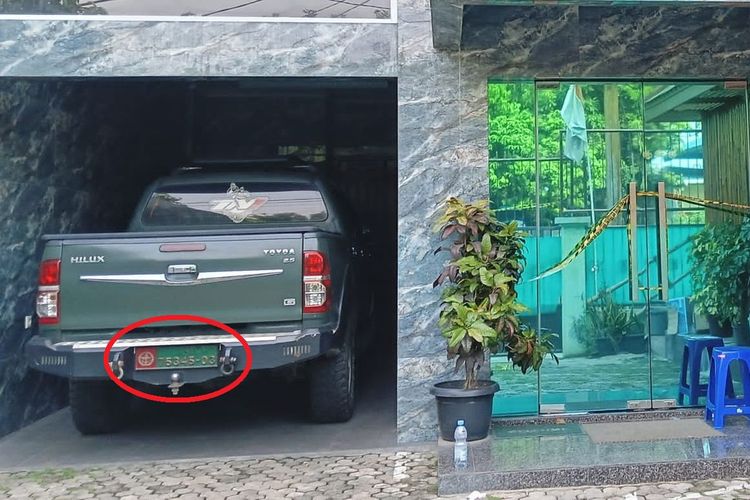 Toyota Hilux berpelat dinas TNI milik Kodam Jaya terparkir di garasi markas pencetak uang palsu di Kembangan, Jakarta Barat