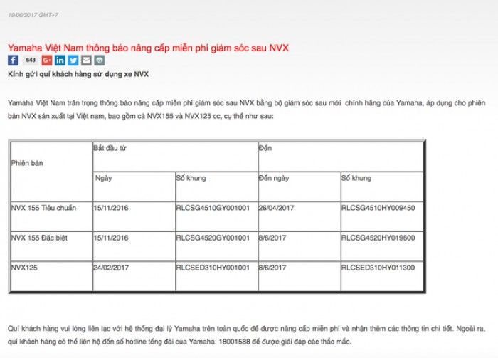 Seperti dilansir Autopro.com.vn, Yamaha Vietnam melakukan penggantian sokbreker belakang setelah ada laporan dari konsumen.