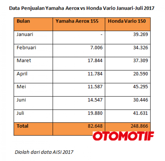 Lebih lengkap mengenai data penjualan Aerox 155 dan Vario 150 bulan Januari hingga Juli 2017, silahkan simak tabel di bawah ini.(Otomotifnet.com)