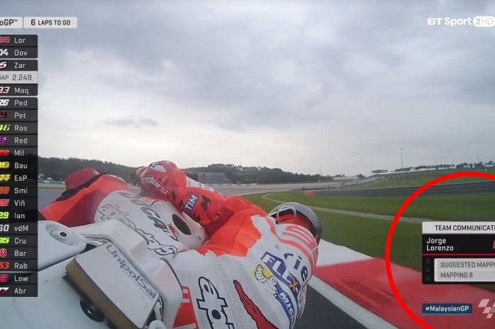 Namun setelah muncul kode tersebut, Jorge Lorenzo tampak melambat dan posisinya yang sedang memimpin balap diambil alih oleh Andrea Dovizioso