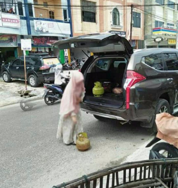 Sebuah foto diunggah oleh Darot Yoesha memperlihatkan seorang ibu-ibu sedang mengangkut beberapa gas elpiji 3kg ke dalam mobil dengan komentar sebagai berikut,
