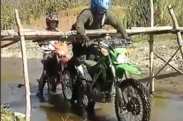 Otomotifnet.com - Memang kalau orang mager banyak akalnya, biker Kawasaki KLX ini tidak kehabisan akal saat sedang menerabas kubangan air dan bertemu rintangan.