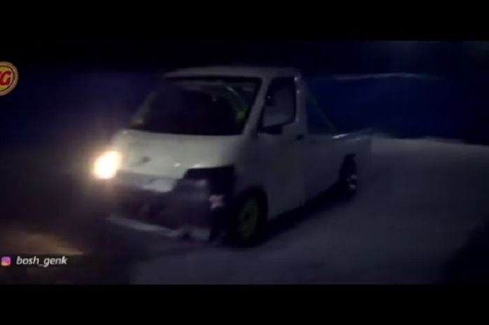 Akun media sosial Instagram @bosh_genk mengunggah sebuah video yang memperlihatkan aksi pikap sayur ini saat melintas di trek balap drag 201 m.