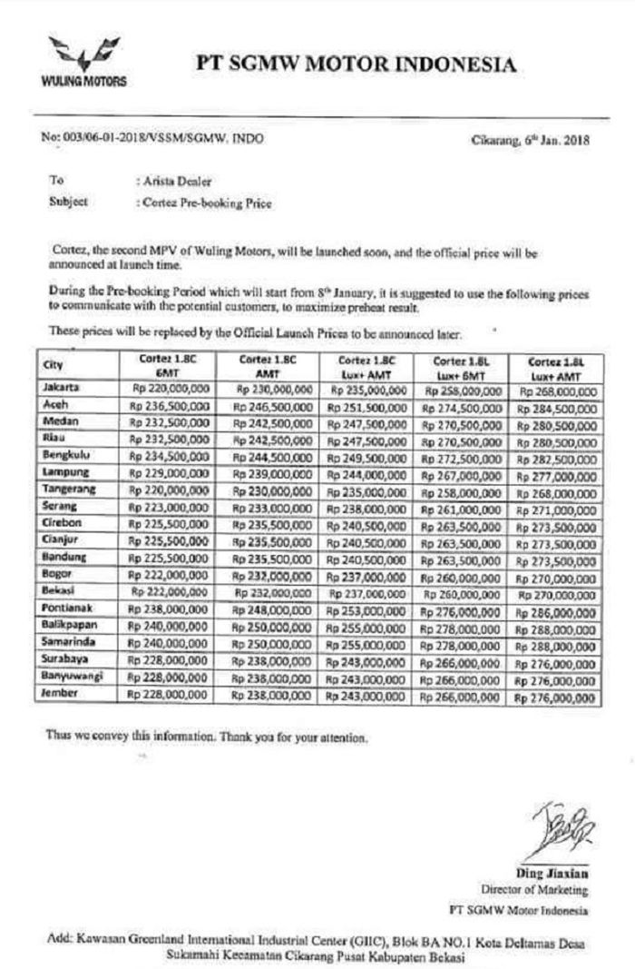 Baru-baru ini, beredar sebuah foto yang mengungkapkan harga pre-booking resmi yang dikeluarkan oleh PT SGMW Motor Indonesia.