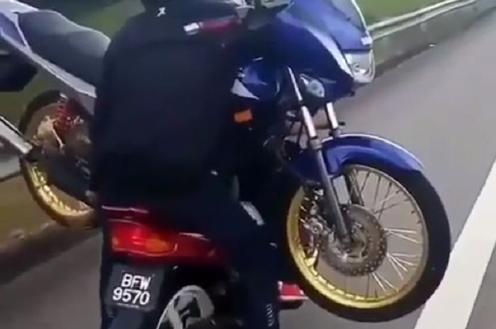 Otomotifnet.com - Ada pemandangan fenomenal nih, sebuah Yamaha RX-Z digendong pake motor bebek di jalan tol.