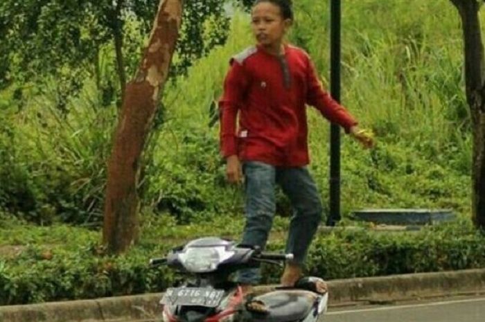 Terlihat pada unggahan foto terebut, sang bocah sedang berdiri di atas Honda Supra dengan gaya seperti sedang berselancar.