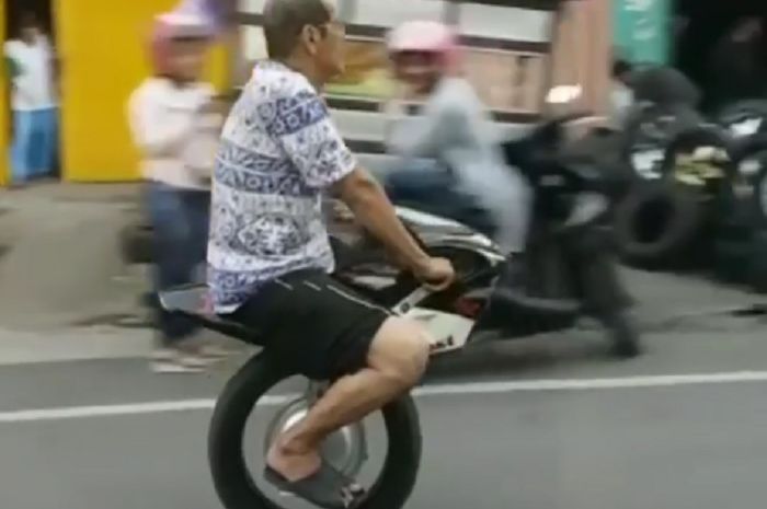 Bahkan sang perekam saja tak percaya kalau motor ini beneran bisa jalan dengan roda satu.