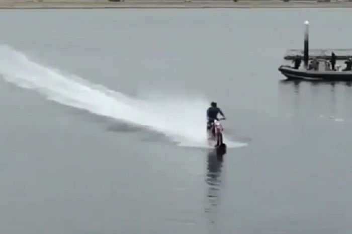 Di dalam video yang diunggah oleh akun Instagram @motocrossxnation, terlihat seorang biker sedang mengendarai motornya di atas air.