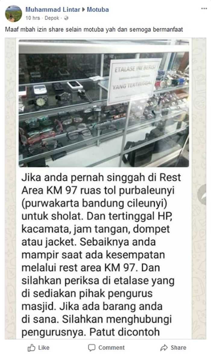 "Jika anda pernah singgah di Rest Area KM 97 ruas tol Purbaleunyi (Purwakarta Bandung Cileunyi) untuk sholat. Dan tertinggal HP,kacamata, jam tangan, dompet atau jacket. Sebaiknya anda mampir saat ada kesempatan melalui rest are KM97. Dan silahkan periksa di etalase yang disediakan pihak penguru. Jika ada barang anda di sana. Silahkan mengubungi pengurusnya. Patut dicontoh pengelola masjid rest area Km 97."