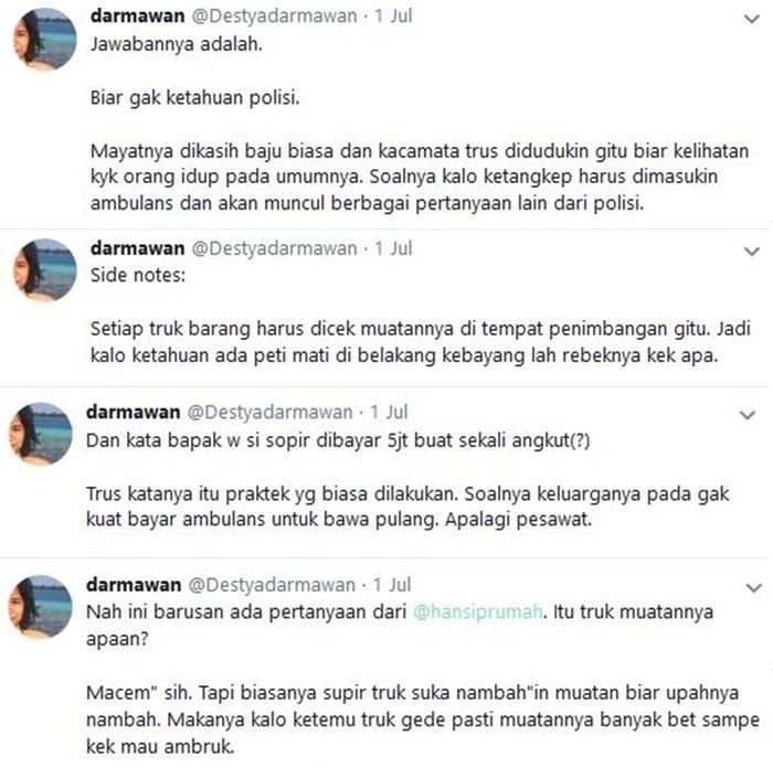 Ia juga mengungkapkan jika bisnis jasa angkut mayat adalah hal yang biasa dilakukan oleh para supir truk.