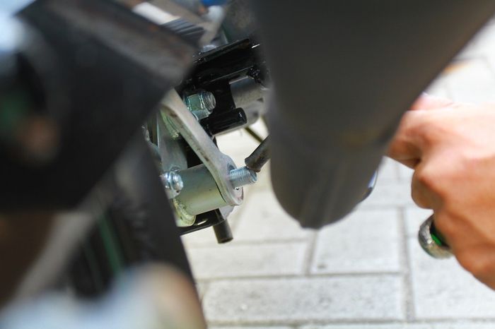 "Sembari menahan motor ke arah kiri, lowering kit dipasang sesuai urutan saat bongkarnya,” rinci Rudi.