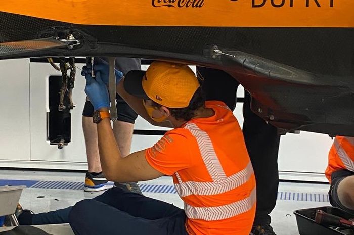 Lando terlihat ikut membantu kru membongkar mobilnya untuk dipacking dan menunggu menuju seri berikutnya di Silverstone, Inggris.